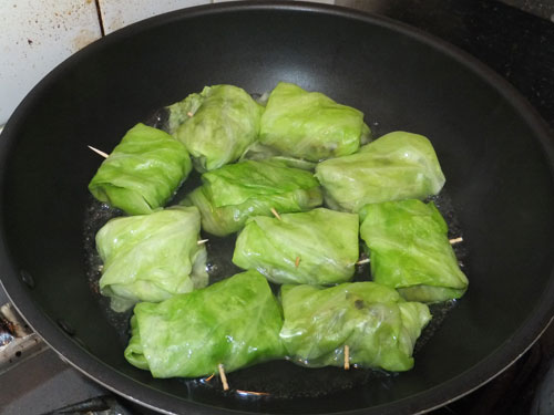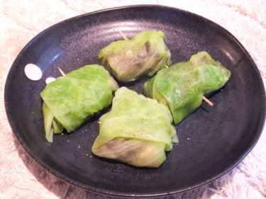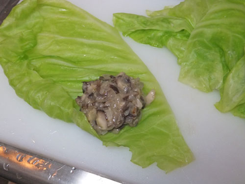 湯がいたキャベツの葉に、きのこソテーを大さじ一杯分くらい入れて、巻きます。