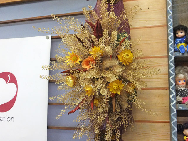 左のリースは玉ねぎの皮を花びらに見立てました。バラの花などのドライは3ヶ月位で散ってしまうそうです。鮮やかな花のリースで保つためには花の時期に入れ替えをするそうです。