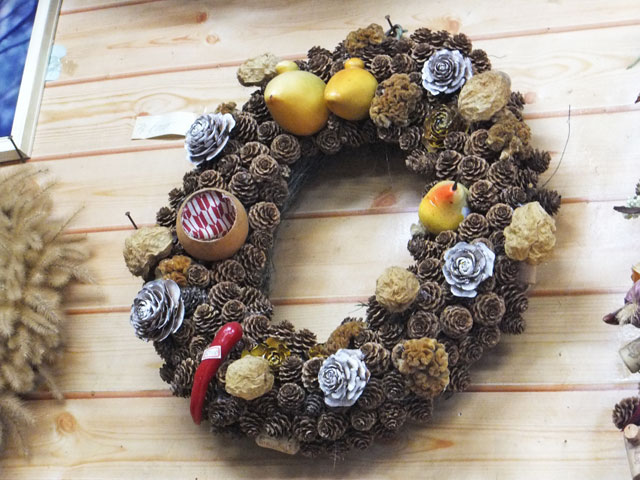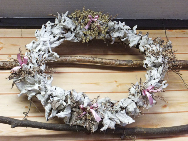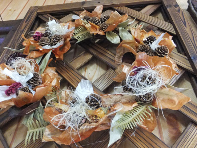 松ぼっくりを使った一般的なリースから、ヤナギ系の樹木の葉の裏側、白い部分を上手に使ったリースや…