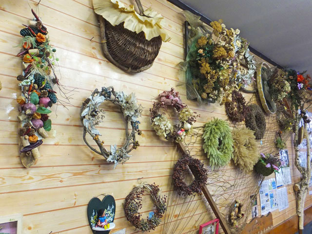 壁画プロジェクト構想を立ち上げたのはこの方、ドライフラワー喫茶エバーグリーンの高橋澄江さんです。万座鹿沢口駅を出て目の前の喫茶店です。店内には高橋さんがこれまで作ったリースがたくさん飾ってあります。