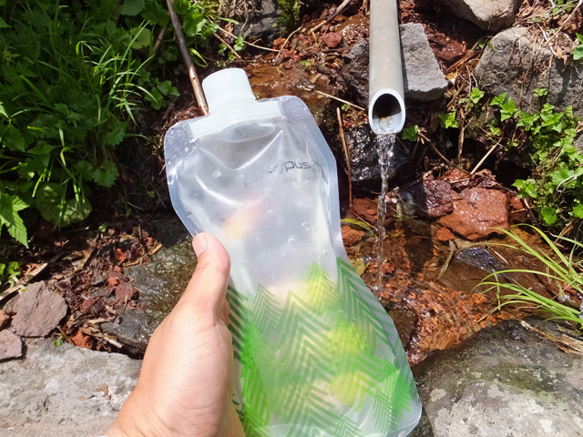 水場に到着する10〜20分前に、手持ちの水を少し飲み、のどを潤しておく。カラカラ状態で水を飲むとがぶ飲みしてしまい、その後、汗が大量に出て電解質不足(低ナトリウム血症)になって深刻な熱中症になる可能性があります。また、冷たい水を一気に飲むと下痢になる可能性もあります(嬬恋清水は通常約5℃)。