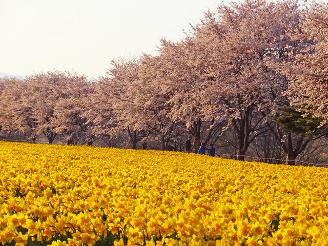 全国としても有数のすいせんの産地である東吾妻町では、毎年4月中旬の日曜日に「すいせん祭り」というイベントを実施するのですが、桜並木の下に30万本のスイセンが咲いている風景は確かに圧巻です。