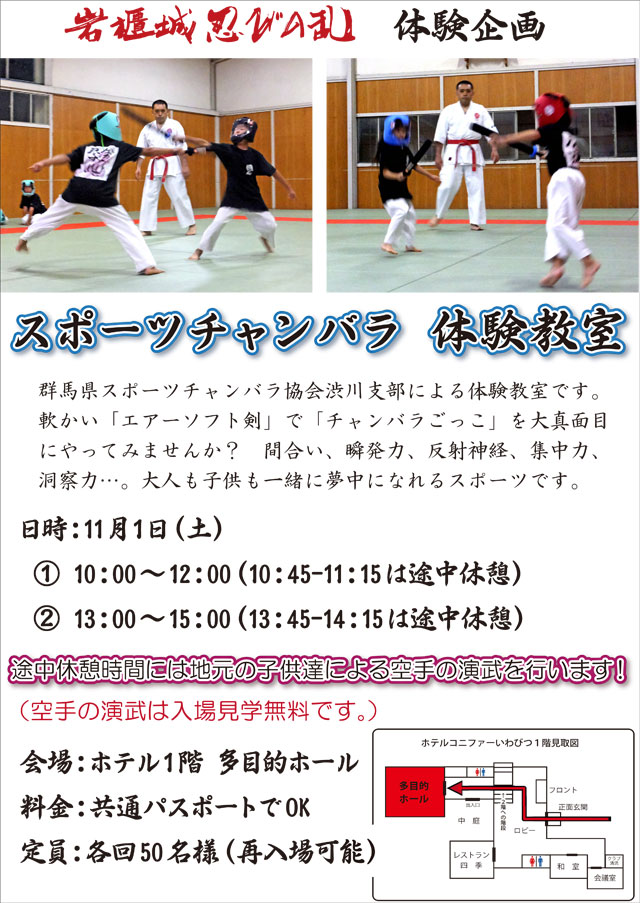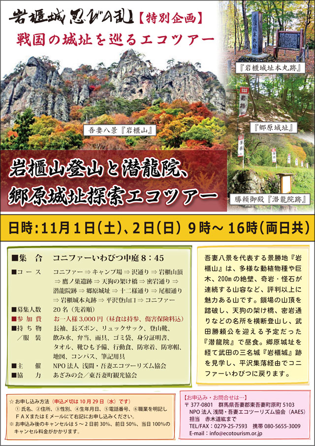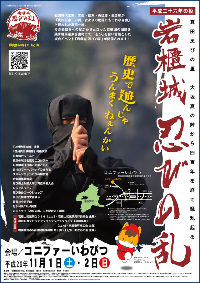 2014年11月1日(土)〜2日(日)、東吾妻町のリゾートホテル『コニファーいわびつ』周辺にて、岩櫃城、歴史、武士、忍者、戦国時代、真田氏…などをテーマにした複合イベント、「岩櫃城 忍びの乱」(http://www.shinobinoran.com/) が開催されました!