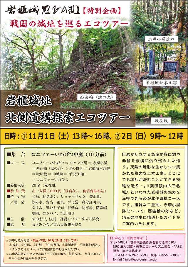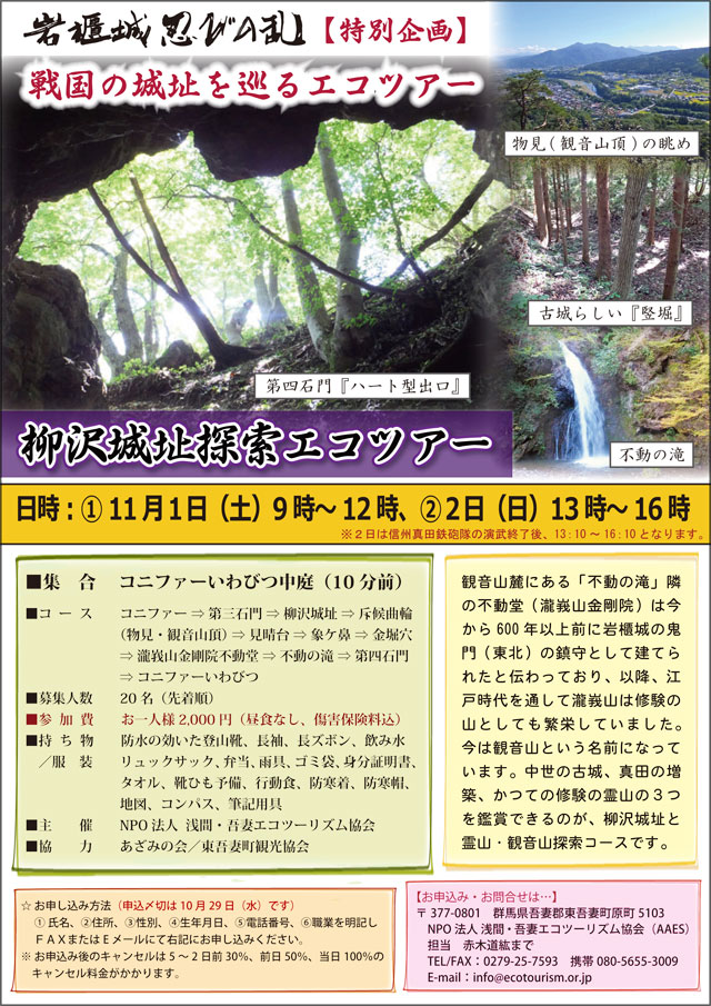 また、浅間・吾妻エコツーリズム協会としては、『戦国の城址を巡るエコツアー』の企画運営の他に、『忍者修行ワールド』というアスレチックランドを実施運営することになっています。