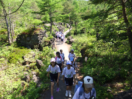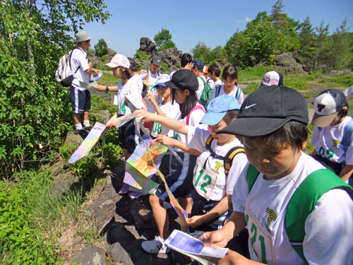 メントスコーラによる火山噴火シュミレーション実験などを終えて、ノリノリ状態の子供たちに、地図を開かせます。野外で地図を見るのに慣れていないようでしたが、この地質図の、鬼押出し溶岩流の流れた跡については理解できたようです。