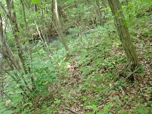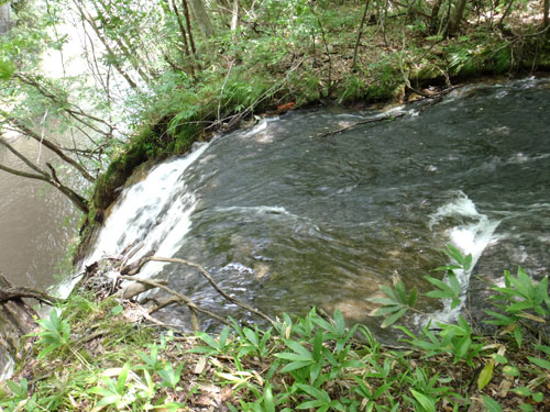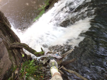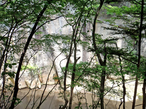 ようやく見つけた、滝を上から見下ろす幻の滝。うう、吸いこまれそうで危険です。少し離れて観察しましょう。森の木々を透かして見える対岸の崖の景色もなかなか良いので、知られざるスポットとして人をここに連れてくるのはいいかも。